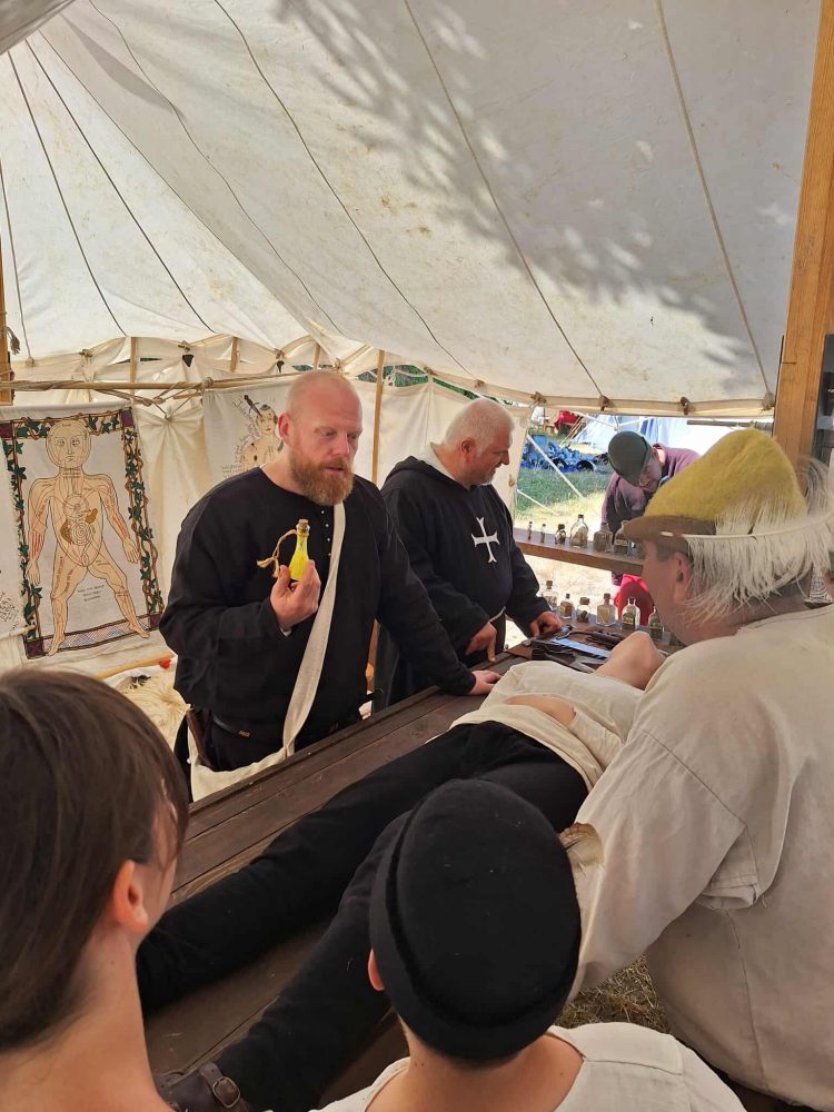 Vrijeme je bilo vrlo vruće, a palatinov osobni liječnik palatina, koji je također bio u pratnji, radio je cijeli dan, kako za obitelj, tako i za ostale članove pratnje. Također je pružao pomoć i široj javnosti. Dva njegova trubadura neprestano su svirala razne instrumente kako bi uveseljavali slušatelje ljepotom glazbe.